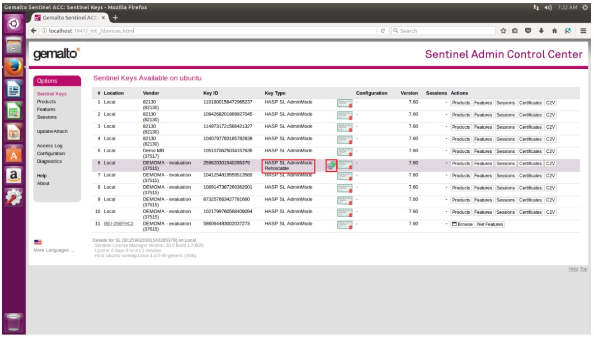 SL能夠?qū)崿F(xiàn) Rehost 的前提條件是 SL本身是可遷移的,也就是 Rehostable 的。可以進(jìn)入 A 電腦上打開 ACC(瀏覽器打開 http://localhost:1947,點(diǎn)擊 Sentinel Keys 查看 SL的狀態(tài)),如下邊截圖所示紅色框?qū)?yīng)的這個(gè) SL就是 Rehostable的,可以遷移,其它SL都不可遷移。如果想遷移其它 SL,就必須將 SL升級(jí)為具備 Rehostable 屬性。 具體請看下邊的步驟二。
