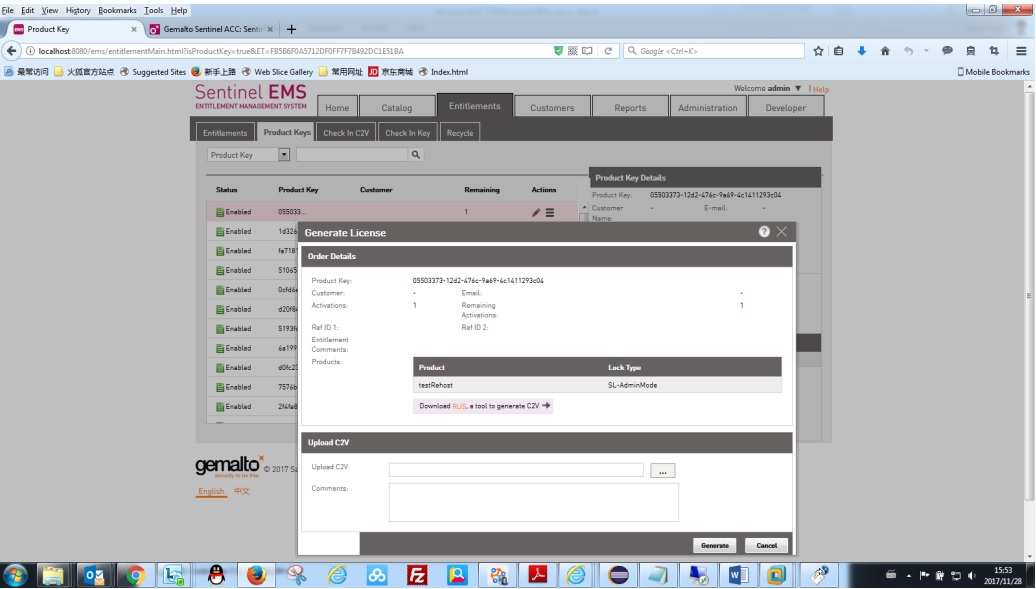 在Generate License窗口中,Upload C2V選擇之前A電腦上需要升級(jí)的SL產(chǎn)生的testRehost.c2v文件。然后點(diǎn)擊 Generate產(chǎn)生對應(yīng)的v2c 升級(jí)文件。