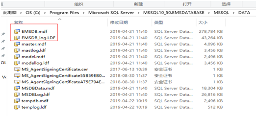 2、進(jìn)入C:\Program Files\Microsoft SQL Server\MSSQL10_50.EMSDATABASE\MSSQL\DATA目錄,把這兩個文件復(fù)制備份。