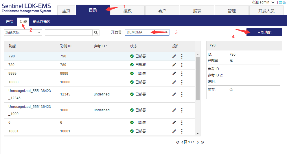 請按圖示步驟選擇1目錄,2功能,3開發(fā)號,4新建功能,其中開發(fā)號是對應(yīng)5個字母的主鎖開發(fā)號,測試用戶請選擇DEMOMA