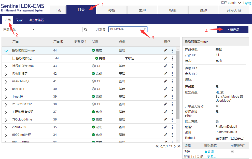 請按圖示步驟選擇1目錄,2產(chǎn)品,3開發(fā)號,4新建產(chǎn)品,其中開發(fā)號是對應(yīng)5個字母的主鎖開發(fā)號,測試用戶請選擇DEMOMA